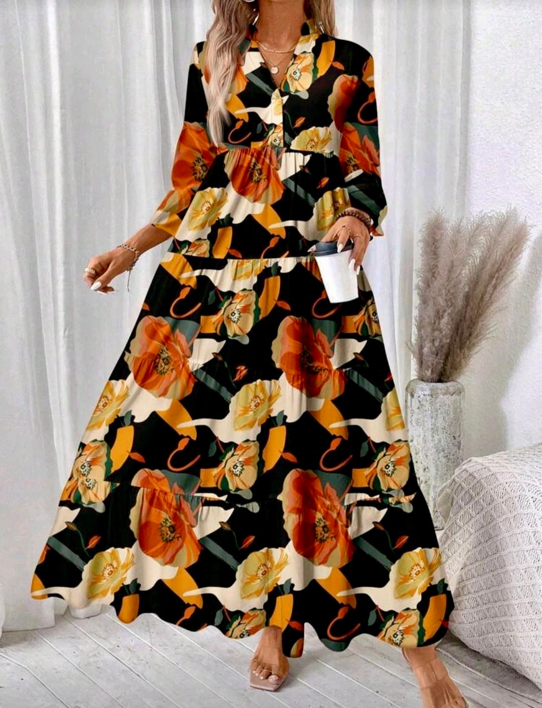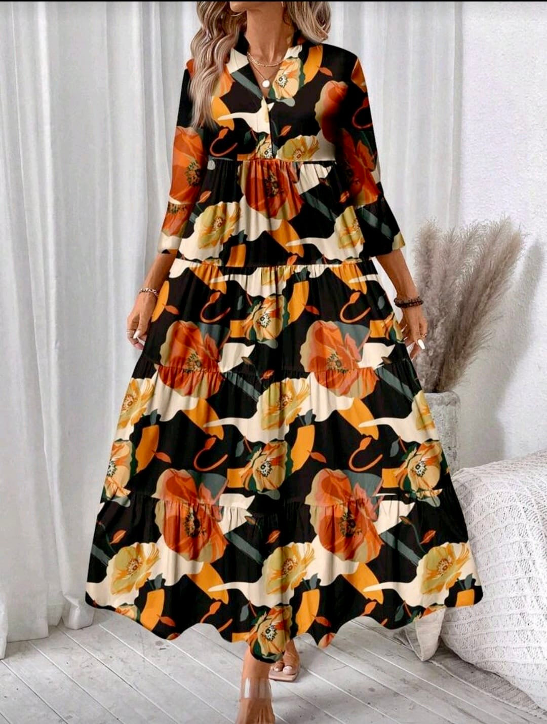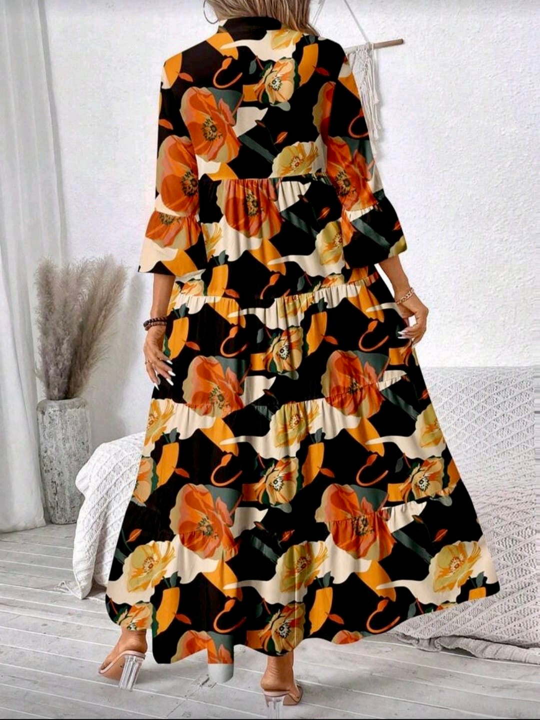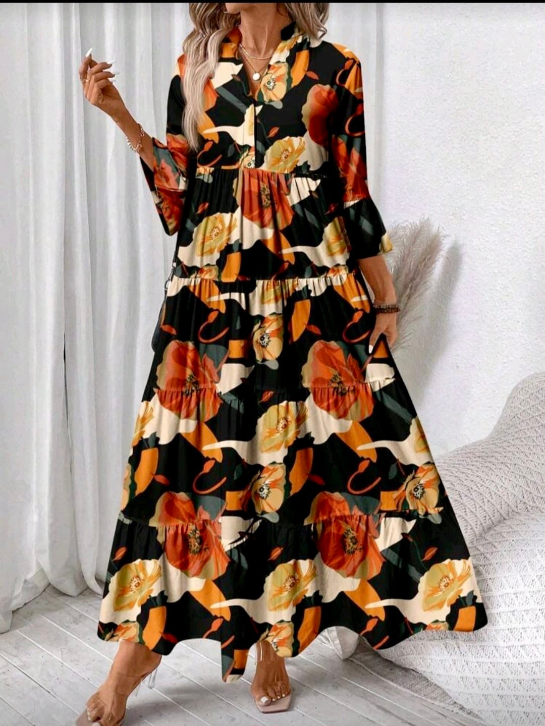 The perfect addition to your autumn wardrobe. This elegant gown features a stunning fall color pattern that is sure to make a statement. With its unique design and high-quality fabric, you'll be sure to turn heads at any event. Upgrade your style and embrace the beautiful colors of the season with Fall Collection
