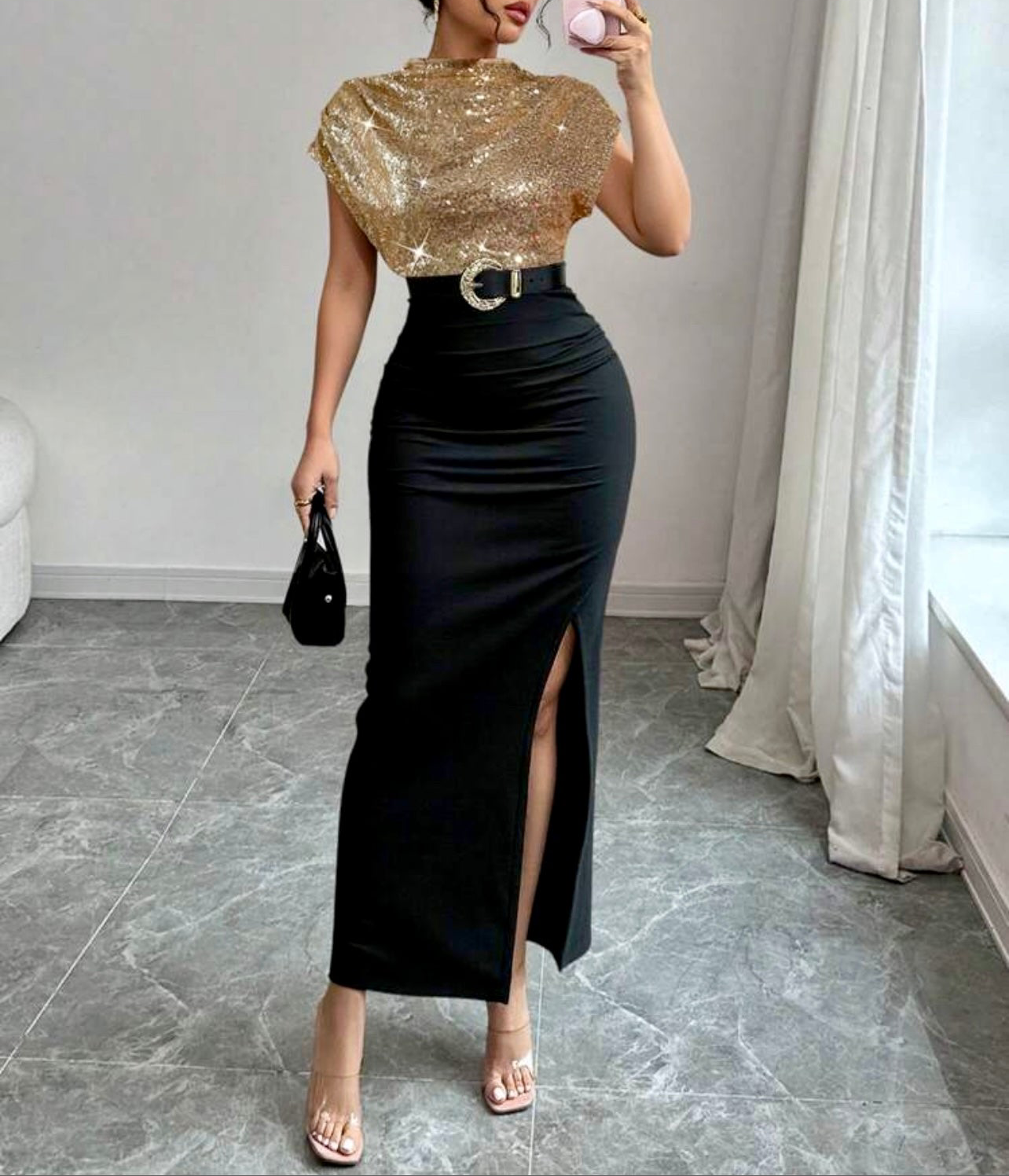 The shimmering gold bodice adds just the right amount of dazzle, while the black skirt offers flattering structure and sophistication. Whether you're attending a special dinner or a festive celebration, this versatile piece ensures you’ll look polished and effortlessly chic.