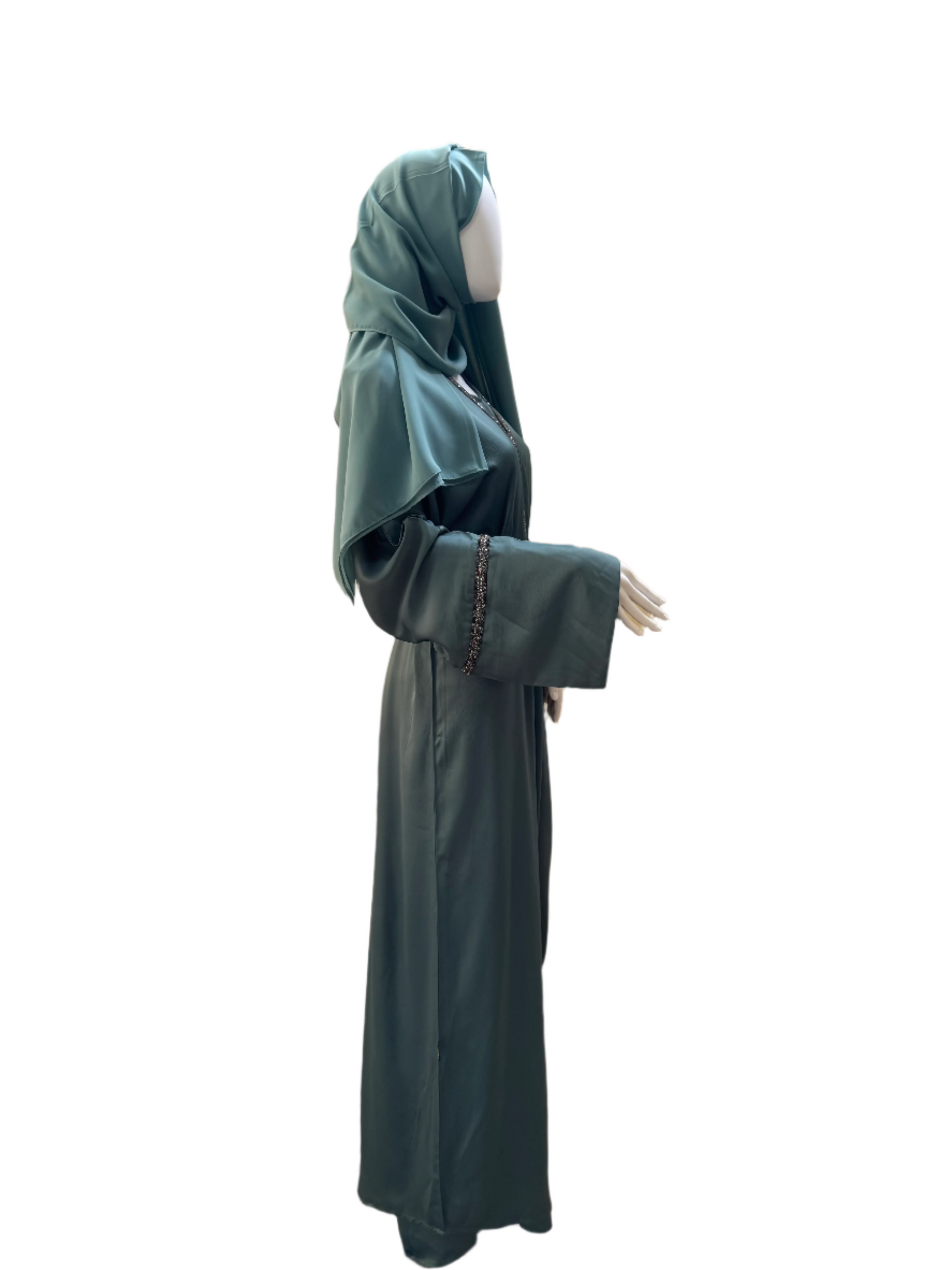 Make a graceful entrance in our Royal Turquoise Satin Abaya — a stunning fusion of deep jewel tones and luxurious texture. Crafted from silky satin, this abaya boasts a rich shine and fluid movement that catches the light beautifully. The unique blend of royal green and turquoise offers a refreshing yet regal look, perfect for formal gatherings, festive occasions, or elegant evenings out. Designed for modest comfort, it features a relaxed silhouette that flows effortlessly with every step.