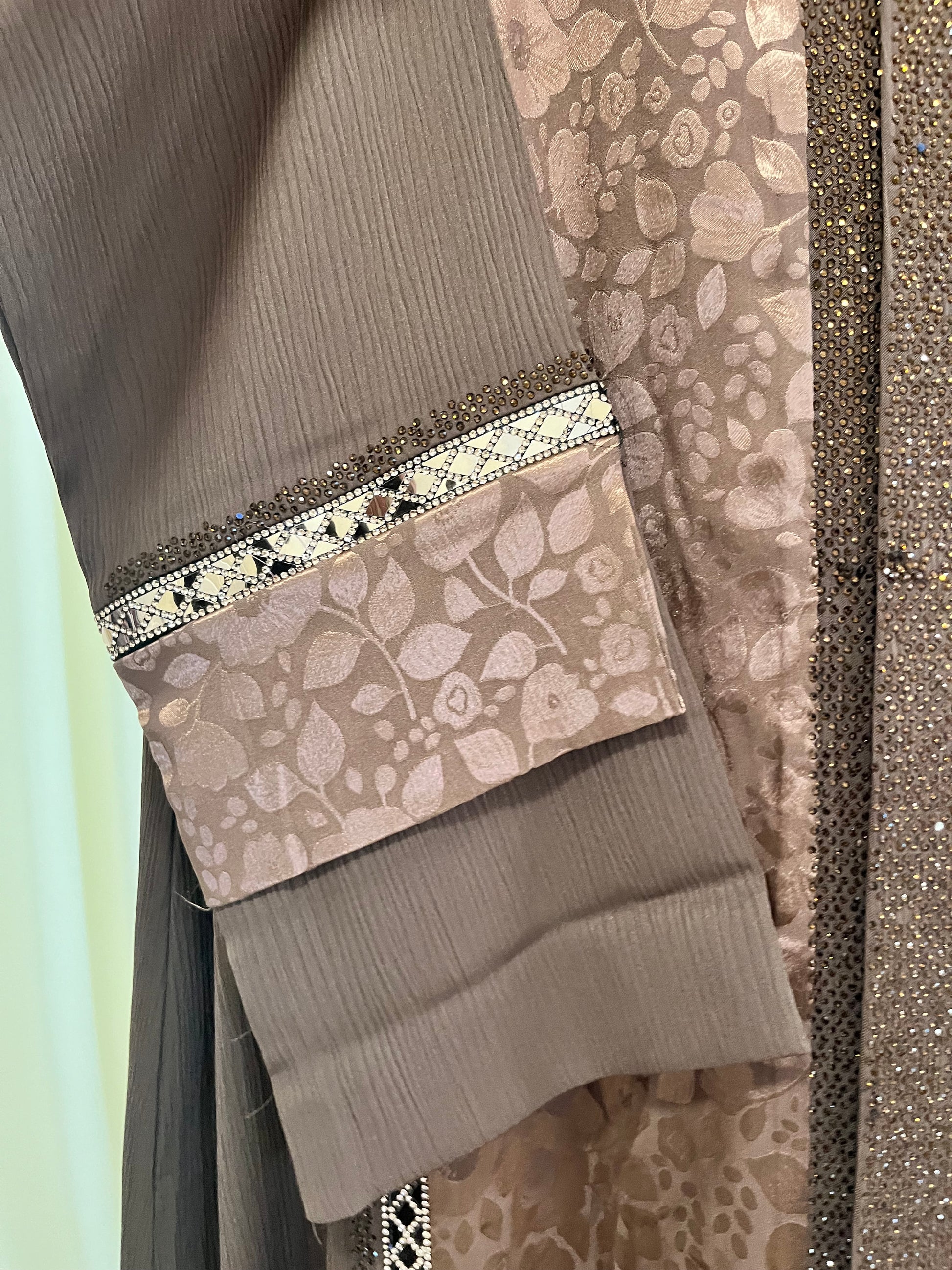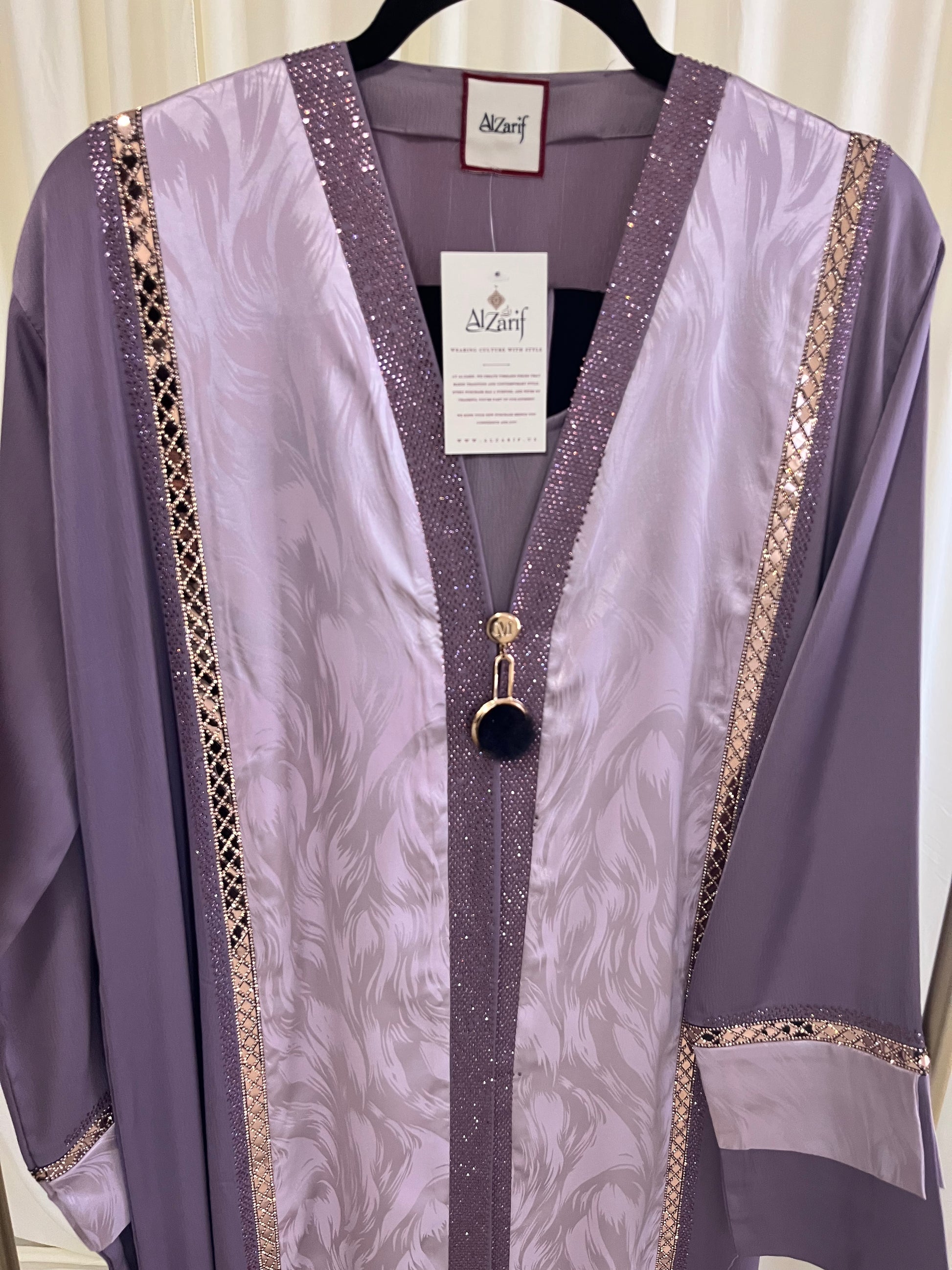 The Dusty Lavender Abaya is a refined expression of modern modest couture. Crafted from premium satin crepe and enhanced with a textured jacquard front panel, this piece features subtle shimmer trims and elegant gold detailing for a truly elevated look. Designed in a flowing floor-length silhouette with full-length statement sleeves, it delivers effortless grace and sophistication. Perfect for Eid celebrations, formal gatherings, and elegant evening events, this abaya embodies timeless luxury with contemporary modest style.