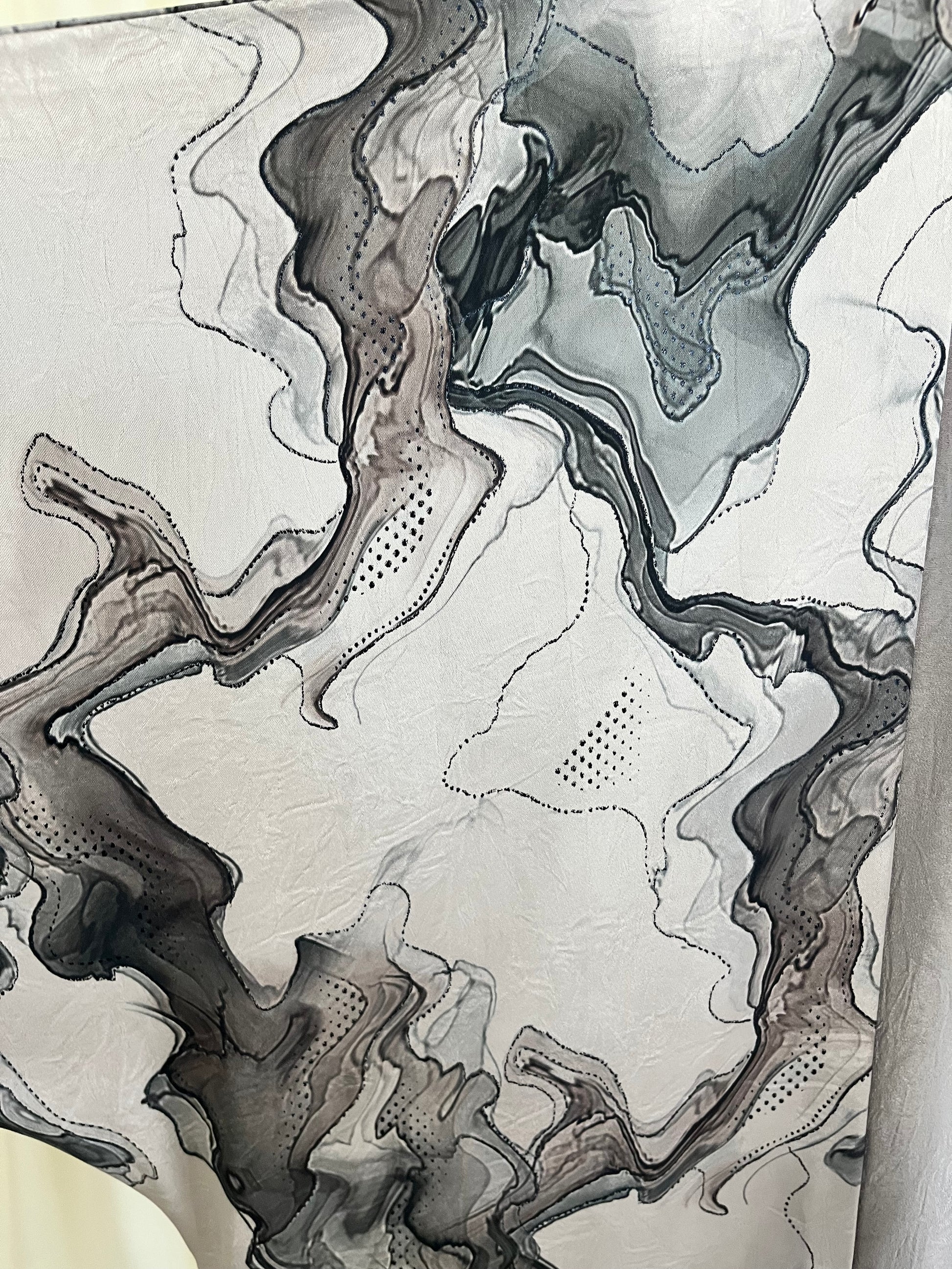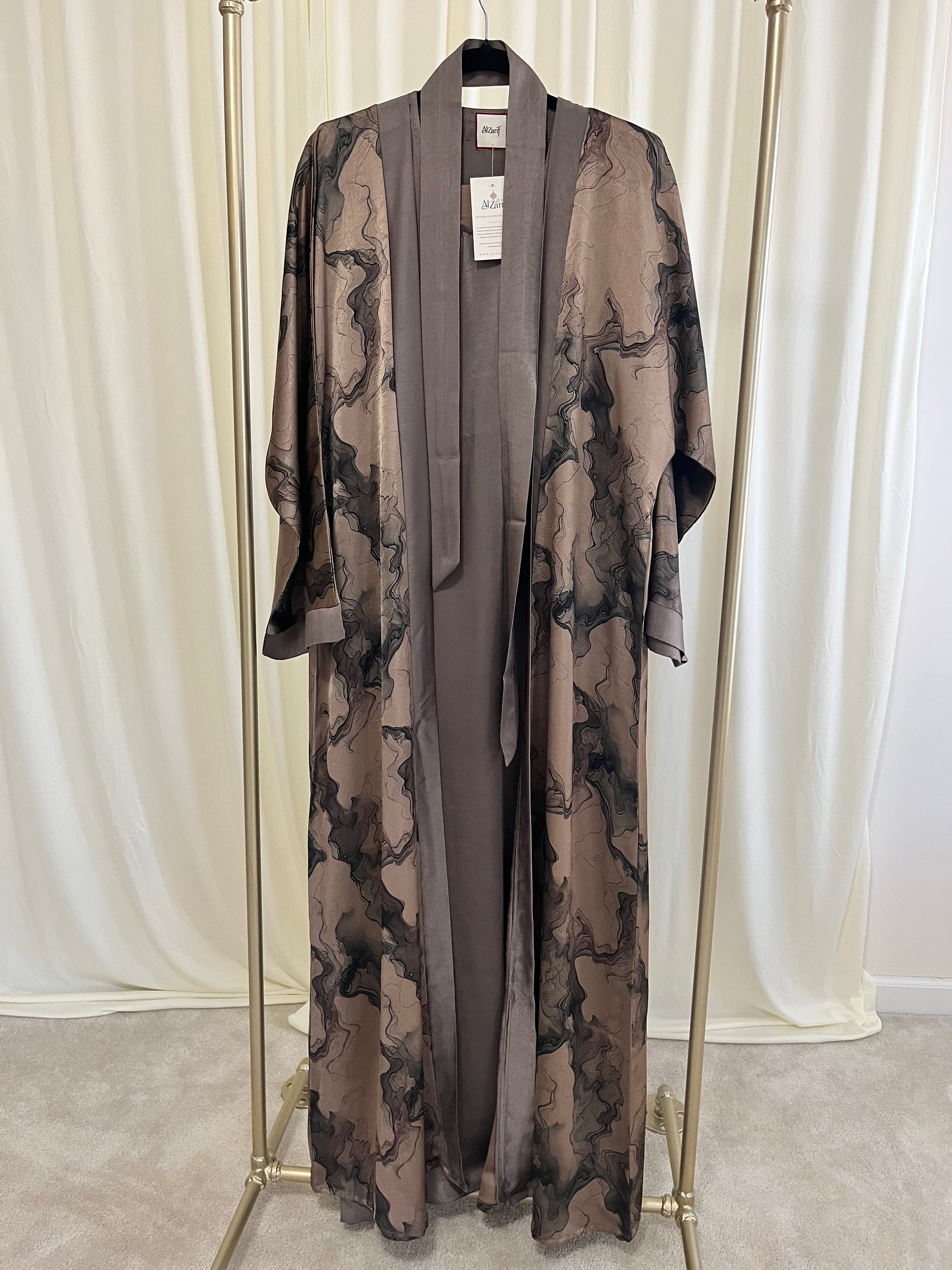 Redefine elegance with our Liquid Marble Open Abaya, a masterpiece of modern modest fashion. Designed for the woman who views her wardrobe as wearable art, this piece features a captivating ink-wash abstract print in sophisticated shades of slate, charcoal, and silver. The sweeping floor-length silhouette is framed by a lustrous, textured lapel that adds a touch of structured luxury. Whether layered over a sleek slip dress for an evening event or paired with tailored trousers for a chic daytime look, this abaya offers a fluid, ethereal drape that moves with effortless grace.