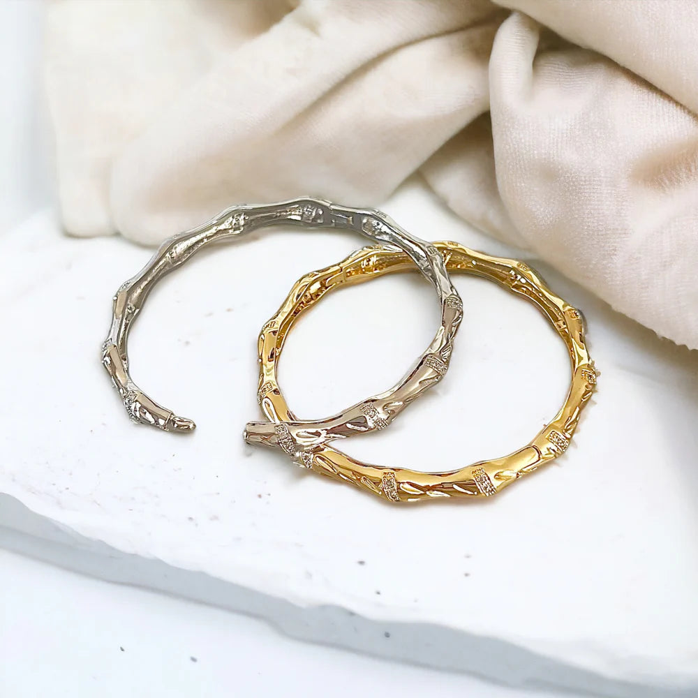 This bangle exudes natural beauty with its intricate textured bamboo design, adorned with sparkling cubic zirconia stones. The texture of the bamboo motifs creates a captivating and realistic effect, giving the bangle a sense of depth and dimension. The hinge closure ensures easy wearability, while the design creates a subtle twist or "twist effect" along the wrist, adding an extra element of interest. Crafted with attention to detail, this bracelet seamlessly blends elegance with nature-inspired charm, making it a versatile and stylish accessory for any occasion.