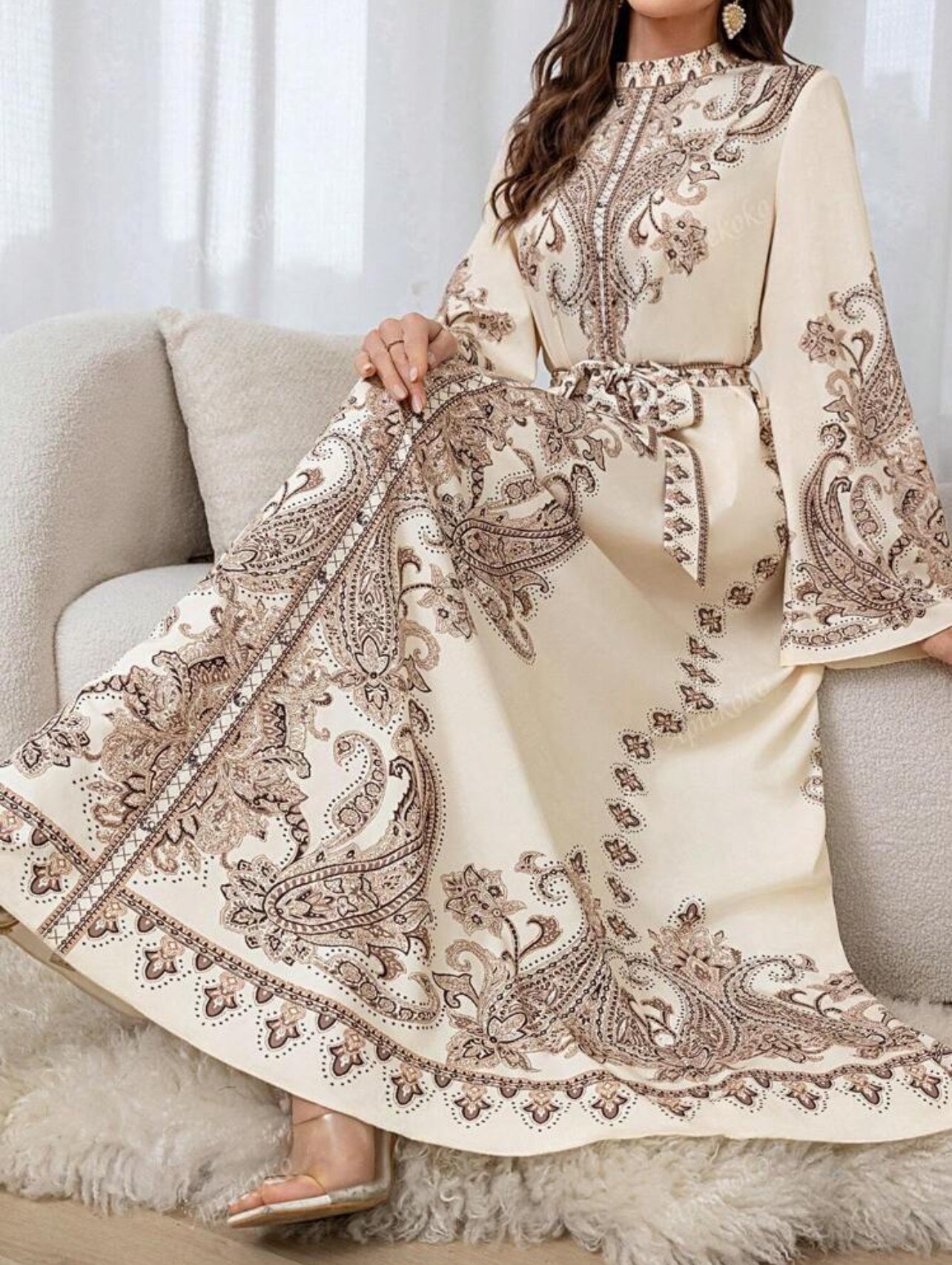 Turn heads with timeless elegance in this beautifully detailed maxi dress, featuring an intricate paisley pattern in warm neutral tones. Crafted from a soft, breathable fabric, this full-length dress combines classic charm with modern comfort. The high neckline and long flared sleeves add a modest yet stylish touch, making it perfect for both casual outings and special occasions.
