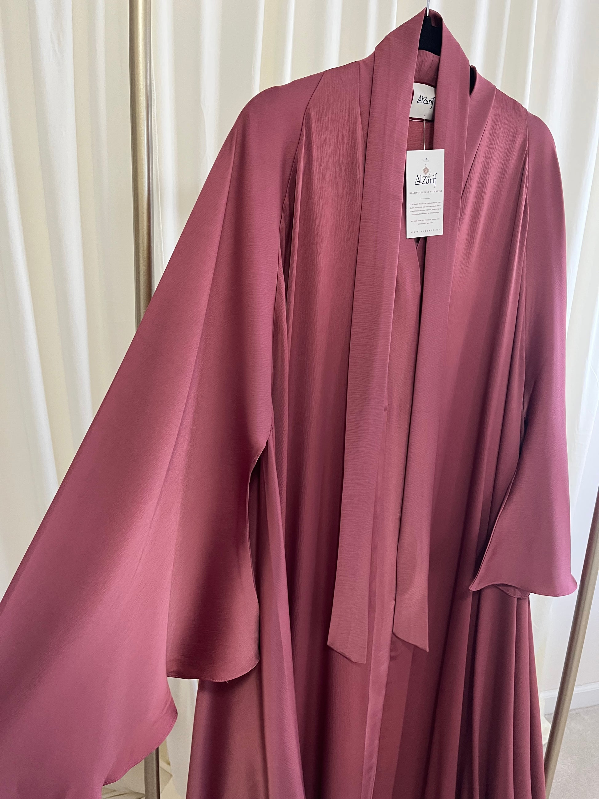 Drenched in a rich, full-bodied vintage wine hue, this abaya is a masterclass in tonal depth. The crinkled chiffon fabric mimics the ripples of a fine silk, catching shadows and light to reveal different shades of burgundy as you walk. To balance the intensity of the color, we’ve added hand-worked silver vine embroidery across the sleeves—a cold-toned contrast that mimics frost on autumn leaves. This isn’t just an abaya; it’s a statement of confidence. It offers a structured drape that feels substantial yet remains airy, making it the ultimate power-piece for the woman who isn't afraid to stand out through color.
